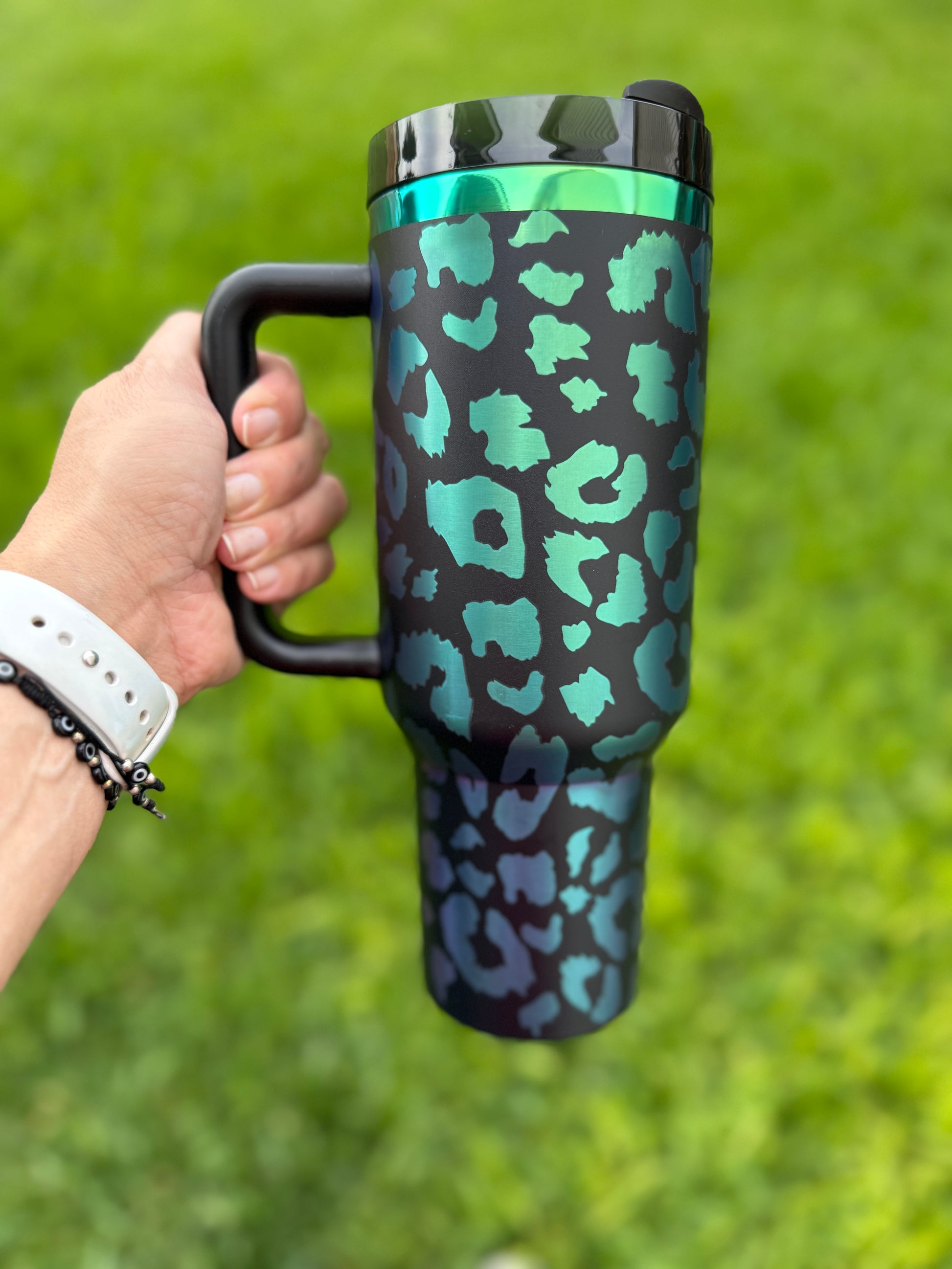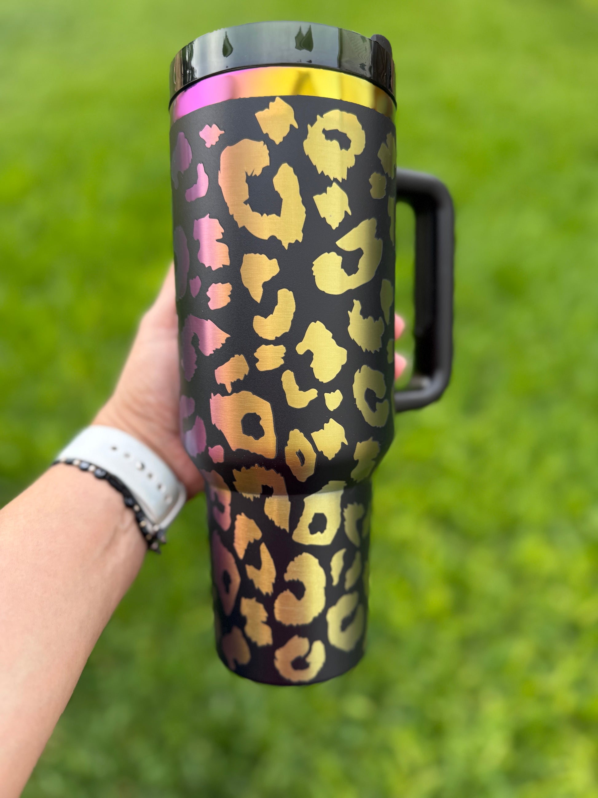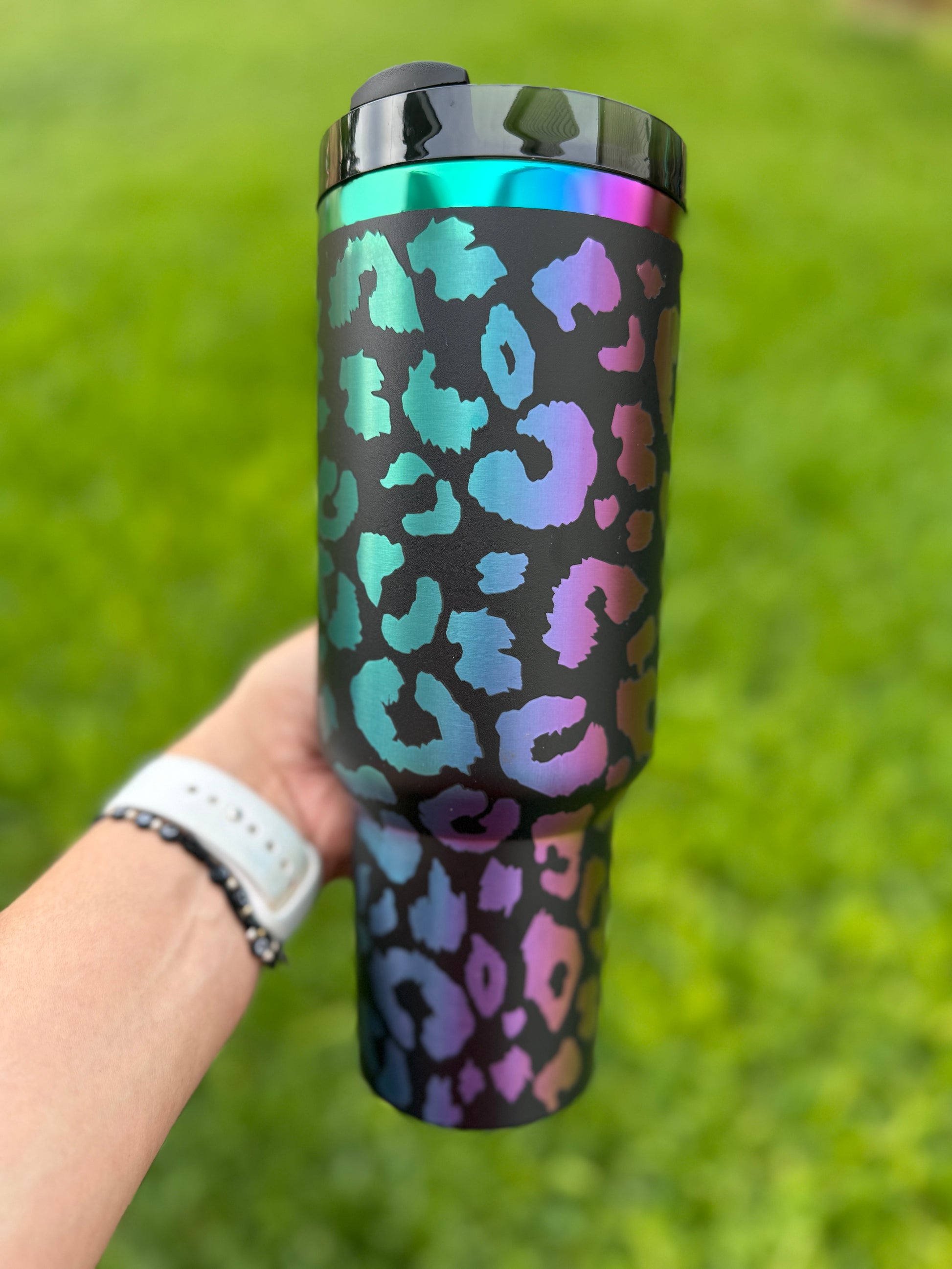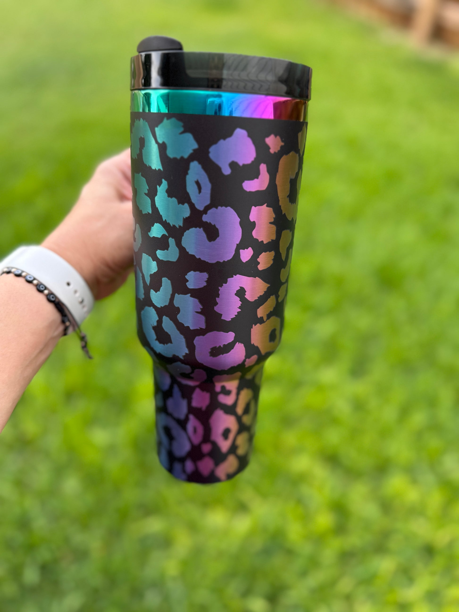 This 40 oz Quencher tumbler features a vibrant, rainbow-plated finish combined with a laser-engraved leopard print design. Its bold and colorful pattern adds a stylish touch while maintaining durability and functionality. Perfect for keeping beverages at the ideal temperature, this tumbler blends eye-catching aesthetics with expert craftsmanship.