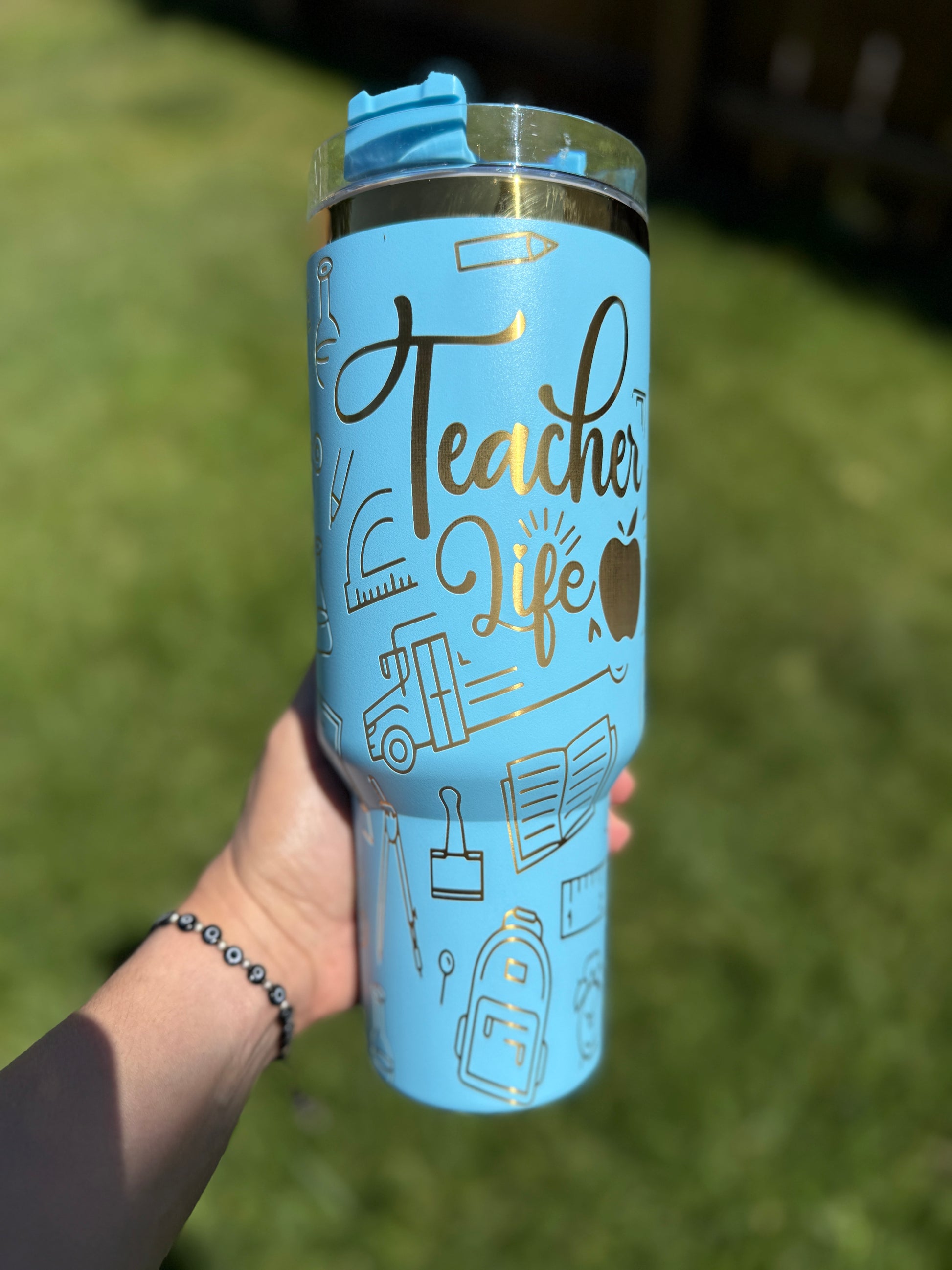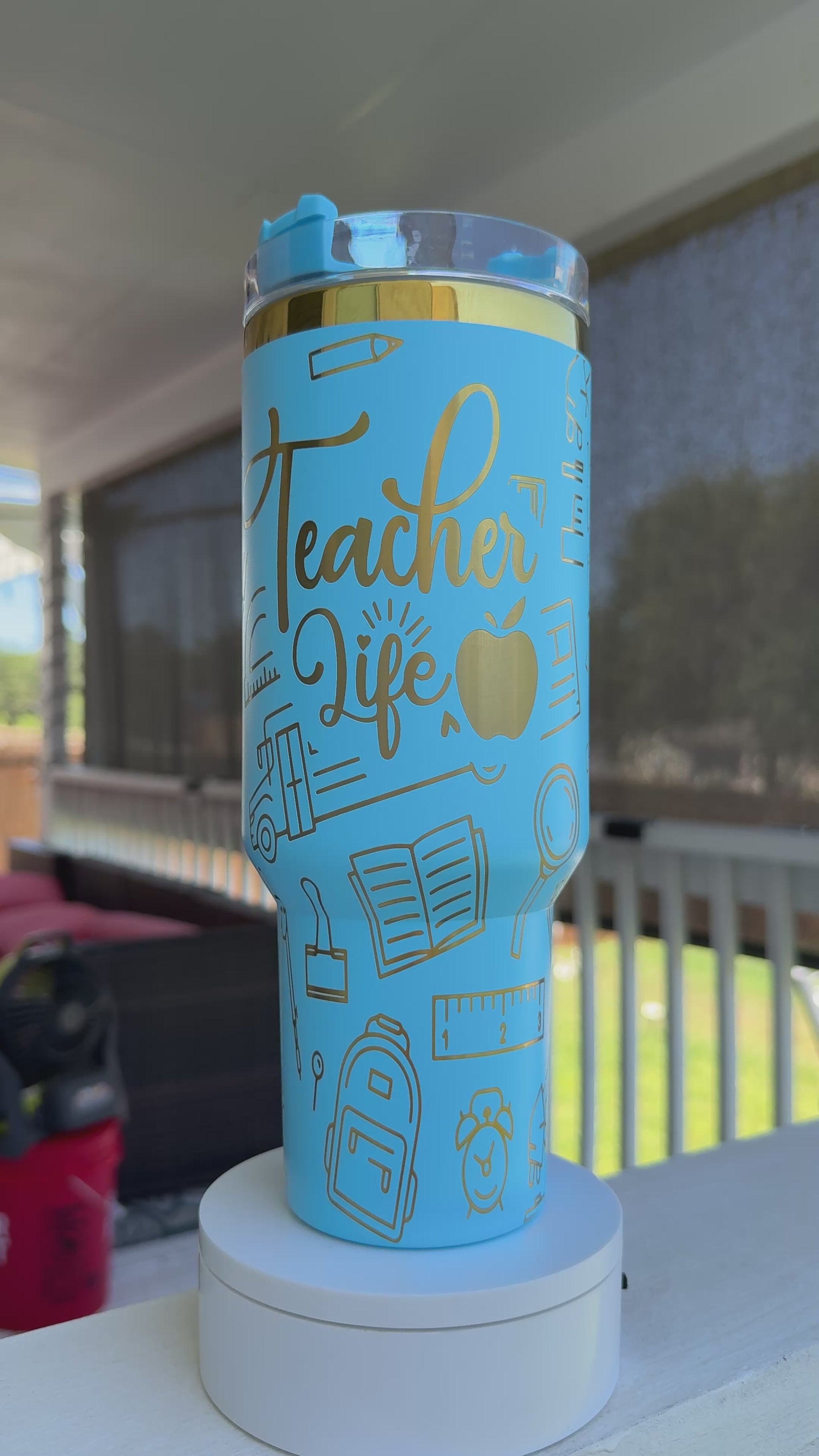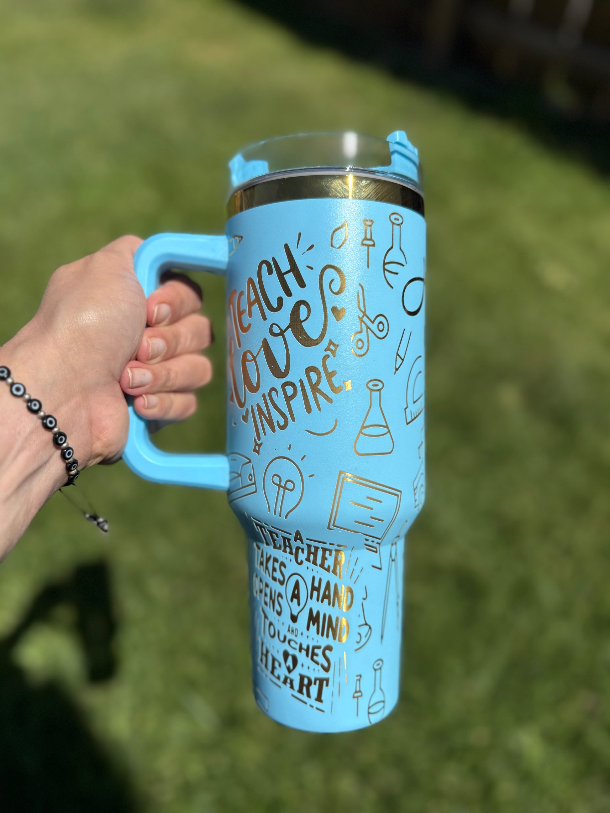 This 40 oz gold-plated tumbler celebrates the teacher’s journey with the inspiring message: teach, love, inspire. Designed for durability and style, it keeps drinks at the perfect temperature throughout the day, making it an essential companion for educators who balance passion and practicality.