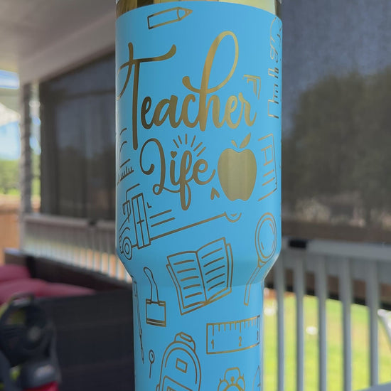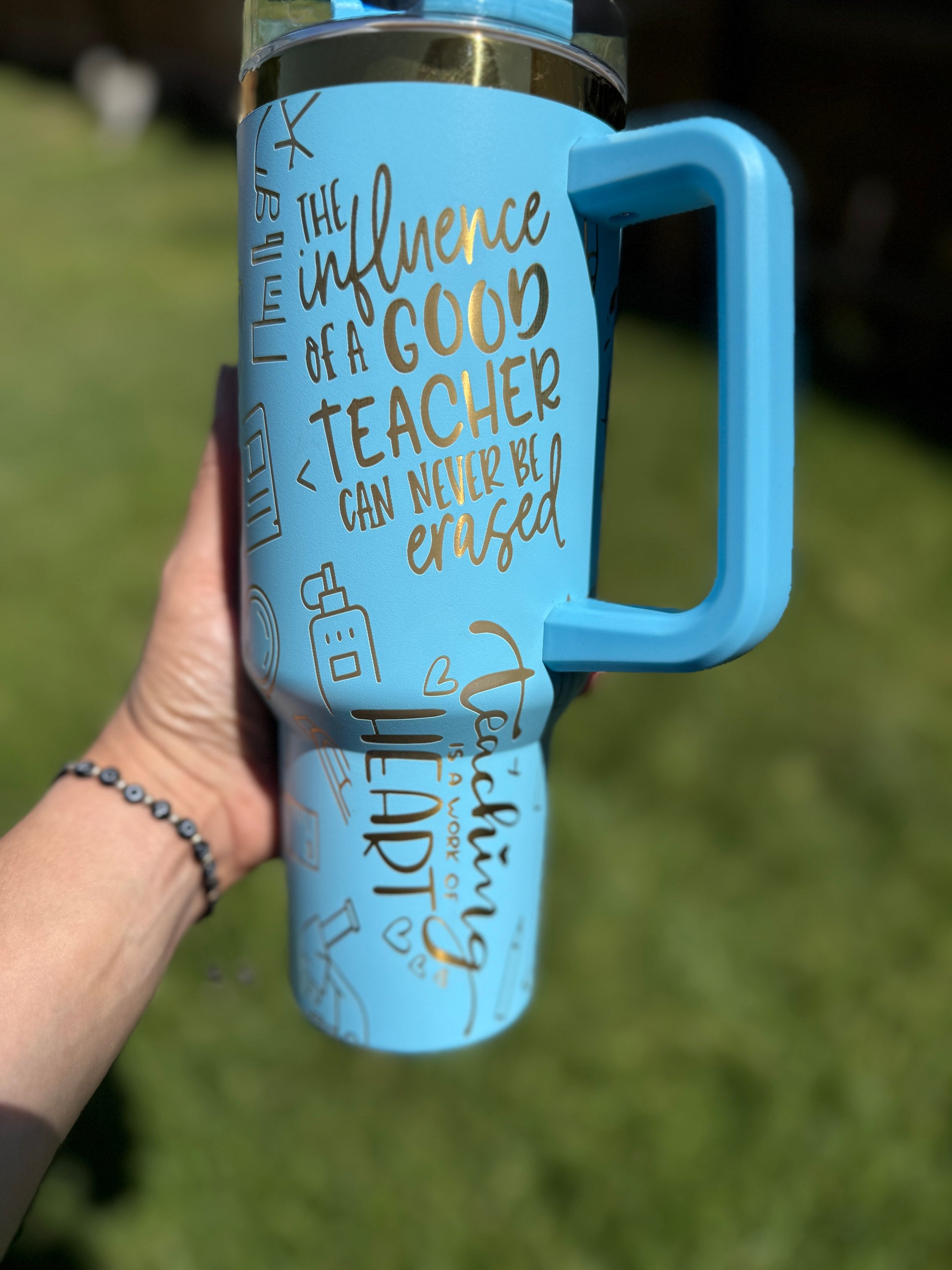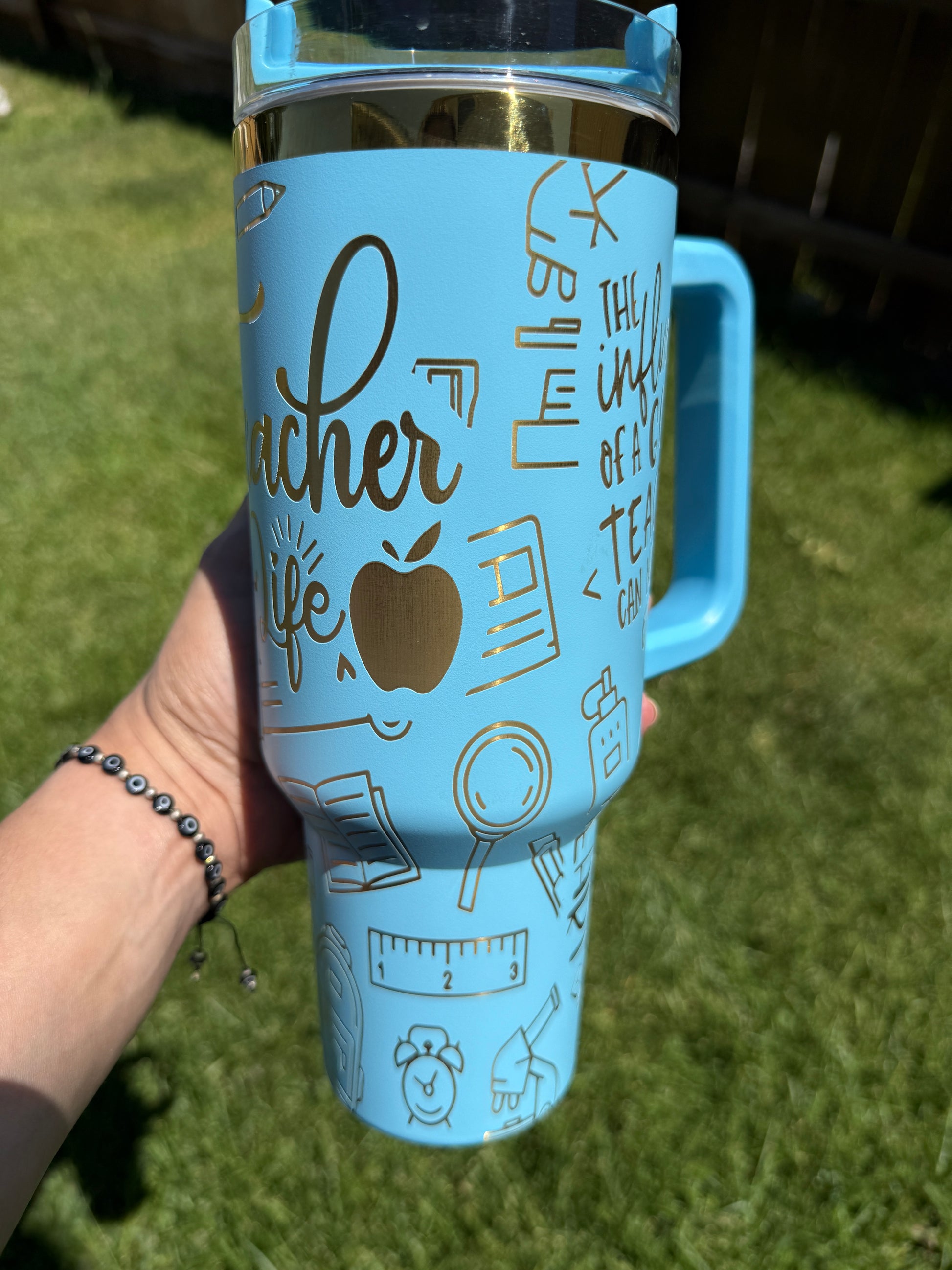 This 40 oz gold-plated tumbler celebrates the teacher’s journey with the inspiring message: teach, love, inspire. Designed for durability and style, it keeps drinks at the perfect temperature throughout the day, making it an essential companion for educators who balance passion and practicality.