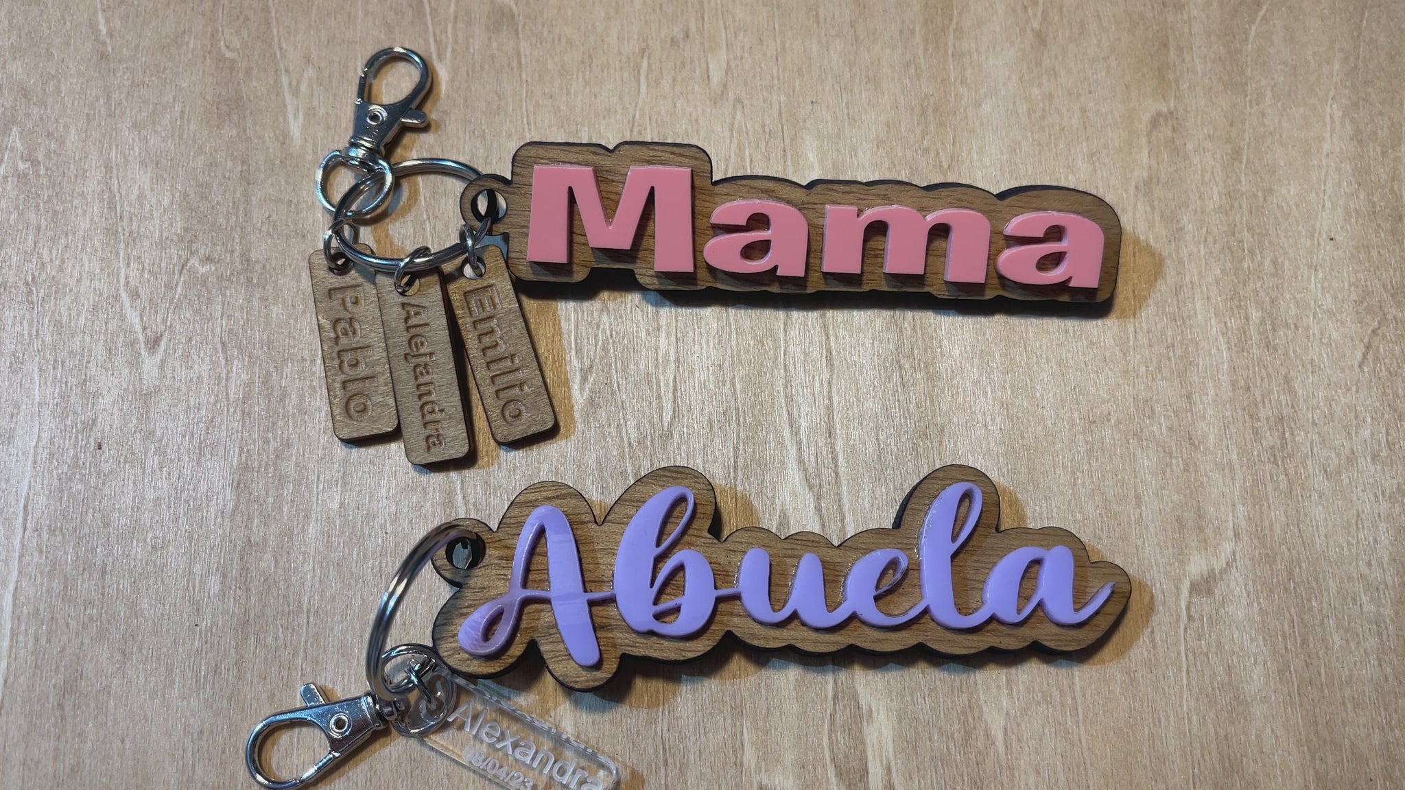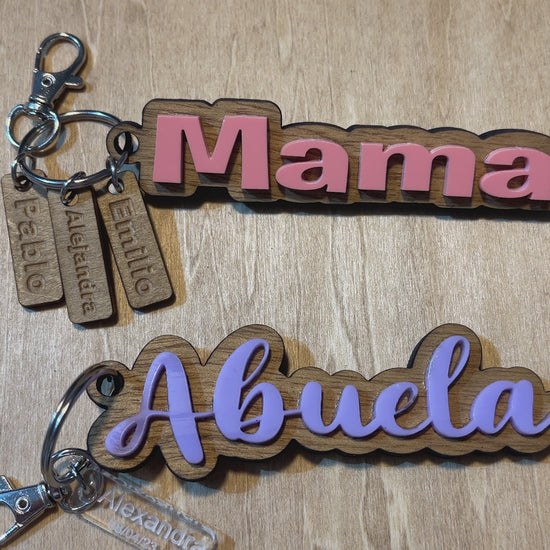 Custom rustic wood and acrylic keychains with Name charms, personalized names, mama, mom, nana, grandma keychains