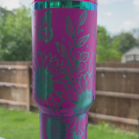 This 40 oz Quencher tumbler features a stunning design of vibrant sunflowers and delicate butterflies, enhanced with a rainbow-plated finish. Crafted for durability and style, it keeps beverages at the perfect temperature while adding a touch of nature-inspired elegance to your daily hydration. Ideal for those who appreciate both functionality and artistic detail in their drinkware.
