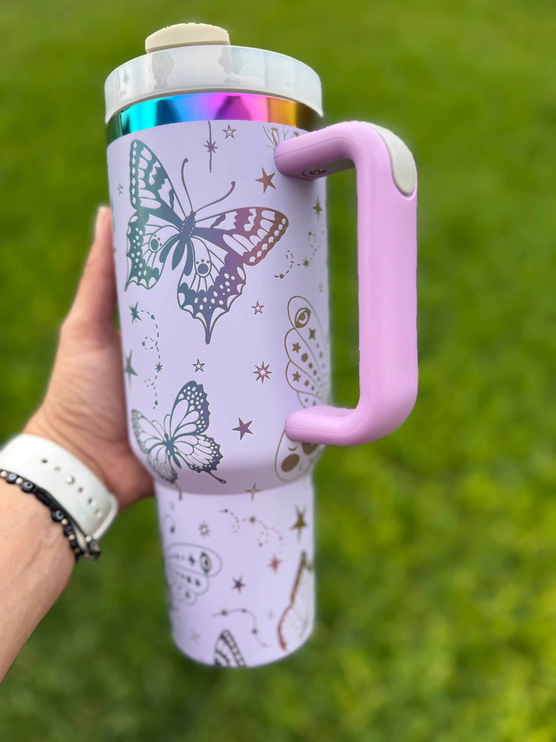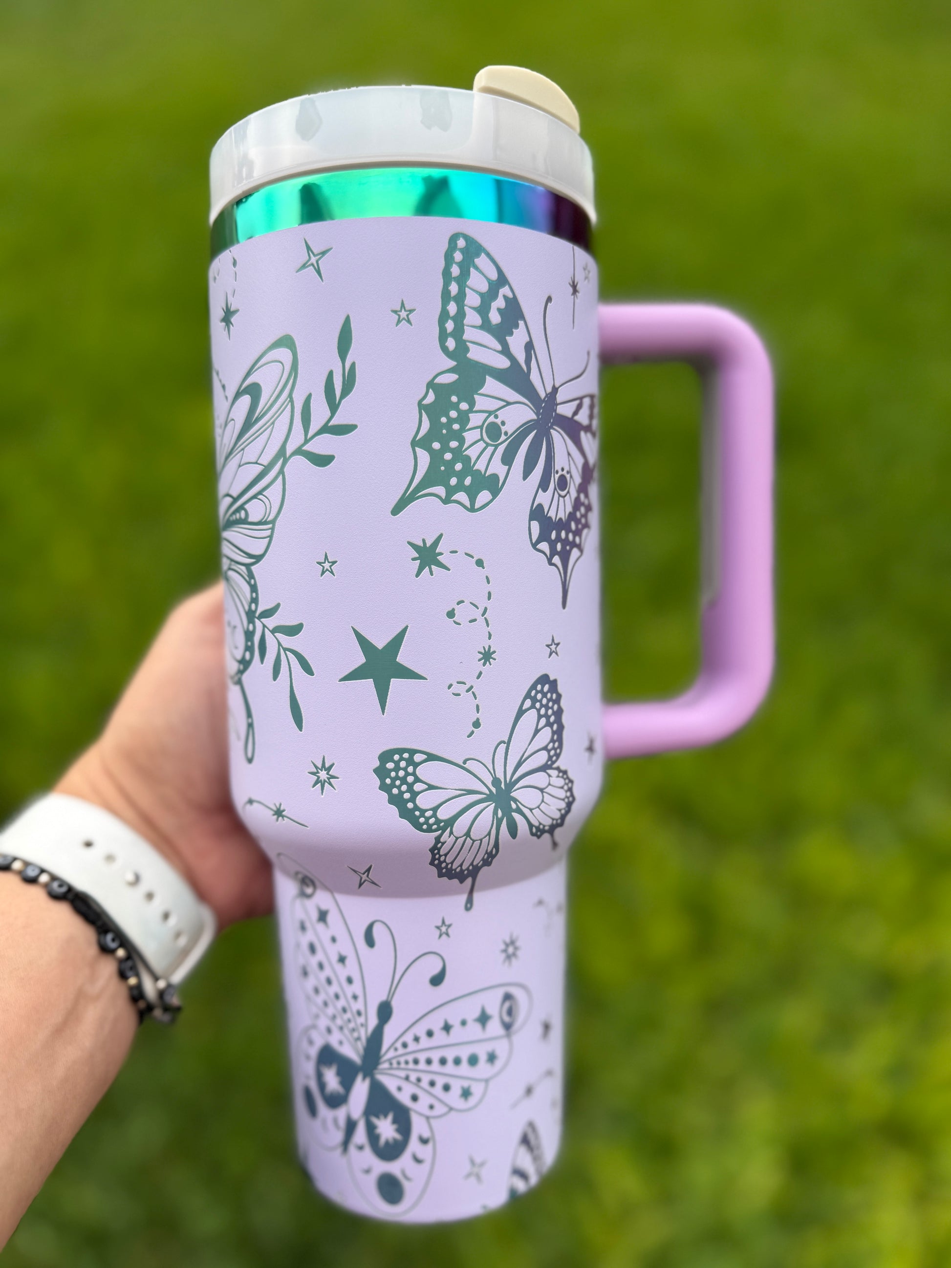 The Butterflies and Stars Mystical 40 oz Quencher Rainbow-Plated Tumbler combines vibrant colors with a spacious design, making it perfect for keeping your beverages at the ideal temperature throughout the day. Featuring a captivating butterfly and star motif, this tumbler offers both style and functionality for those who appreciate a touch of magic in their daily hydration. Its durable construction ensures long-lasting use, making it an excellent choice for on-the-go lifestyles.