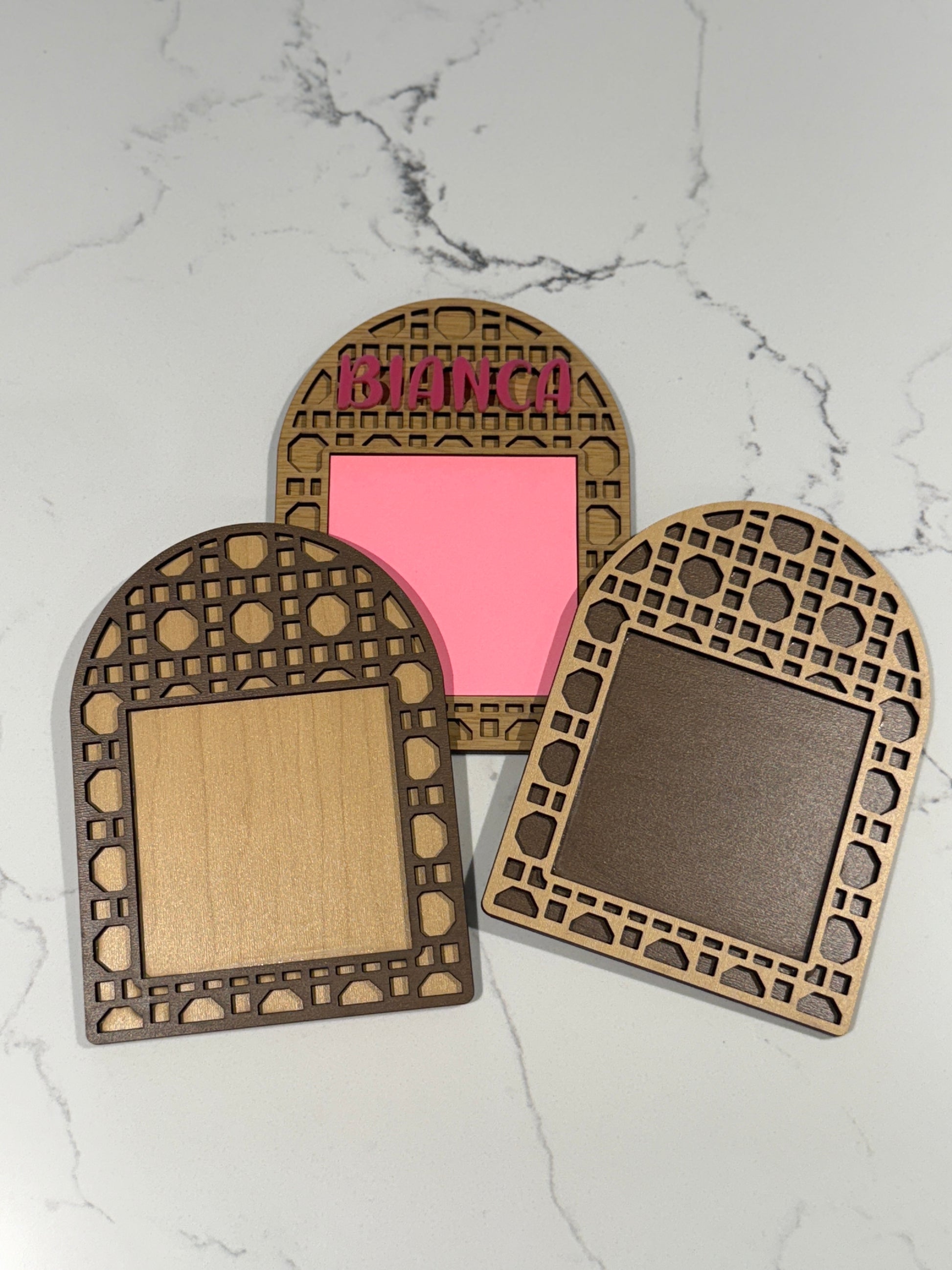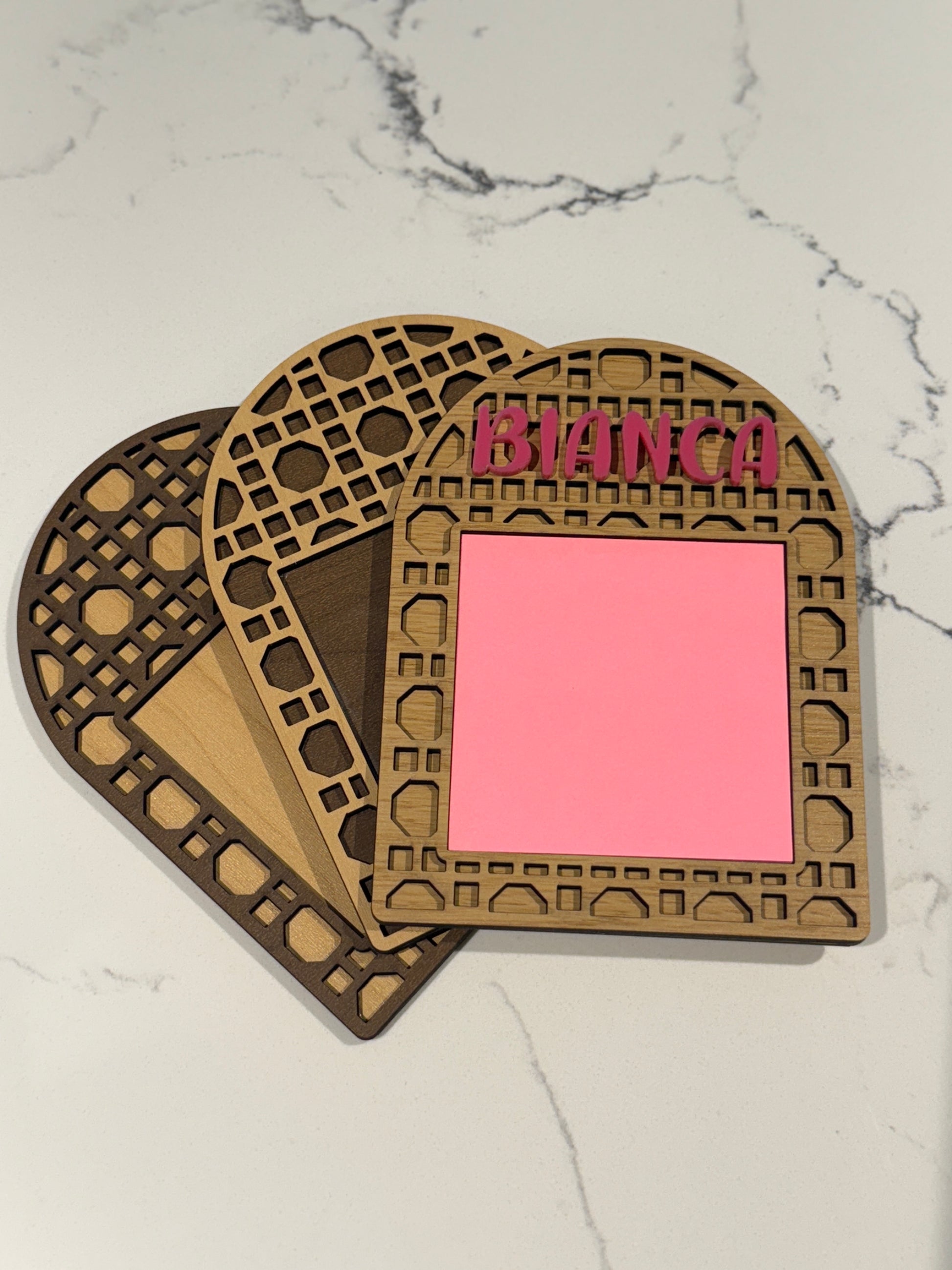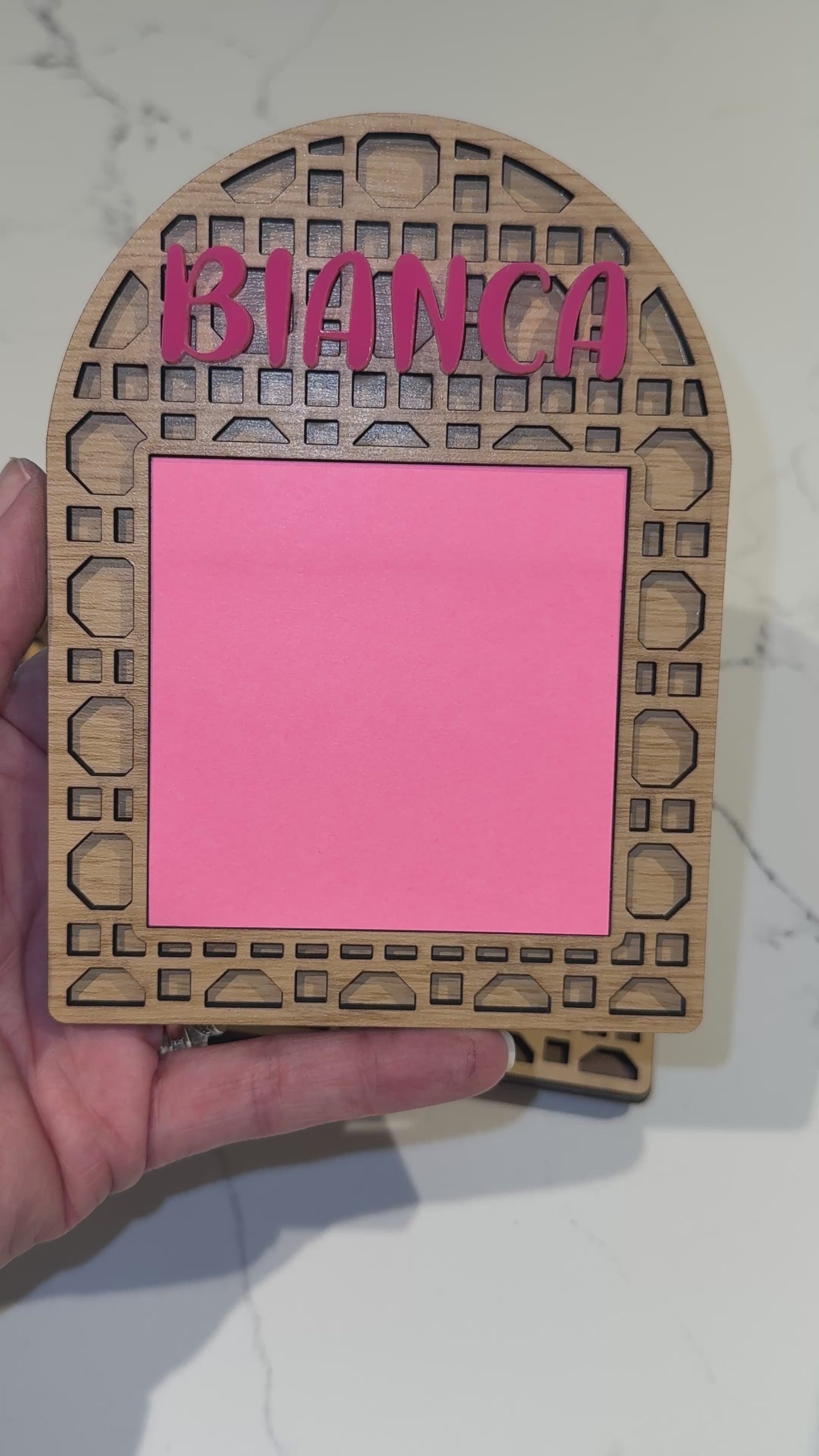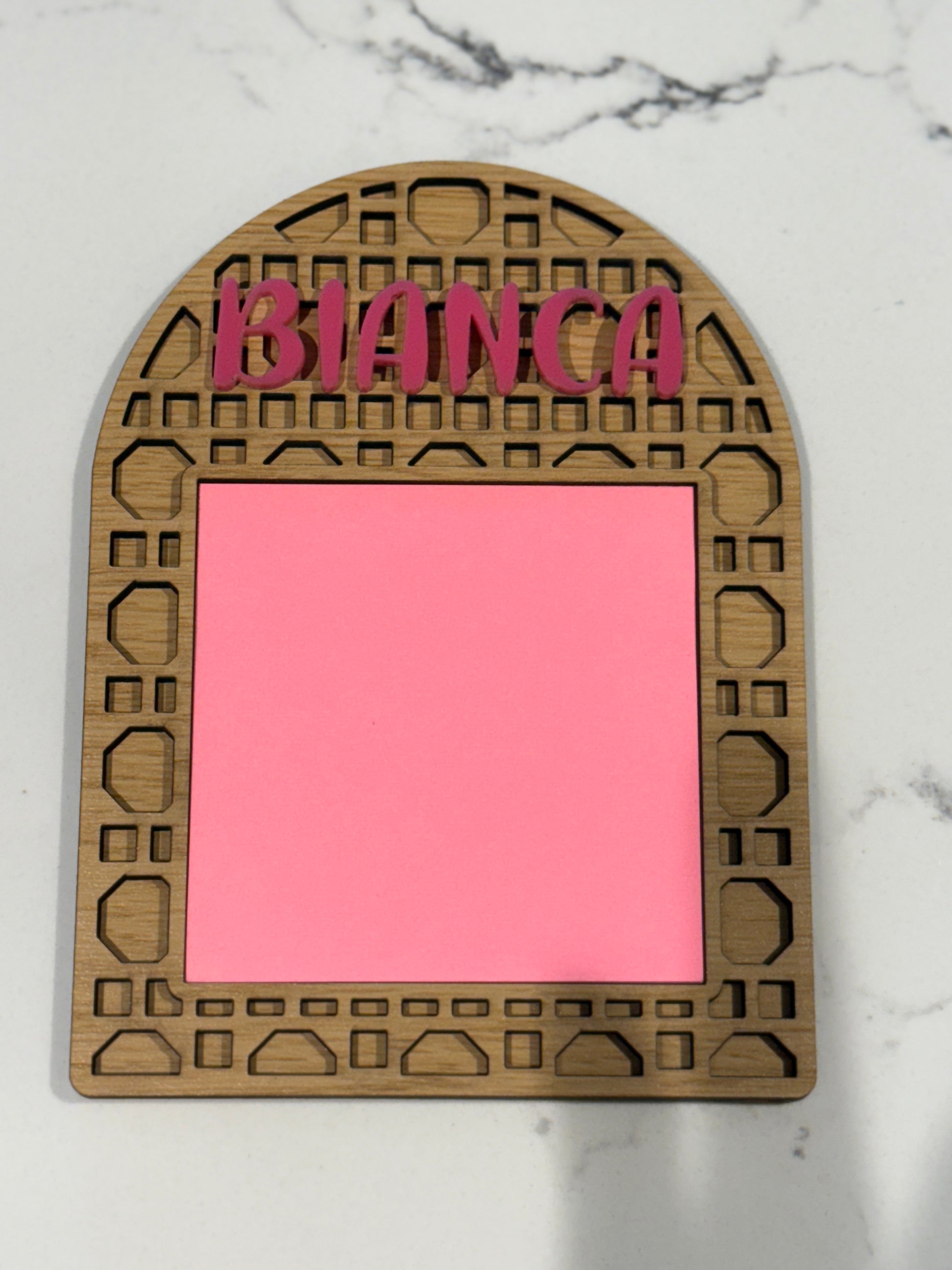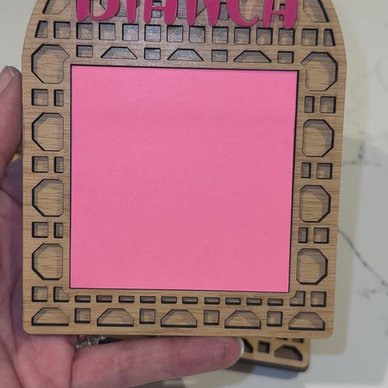 This one-of-a-kind note holder can be personalized with any name or phrase. Choose the preferred design and acrylic color for the name.