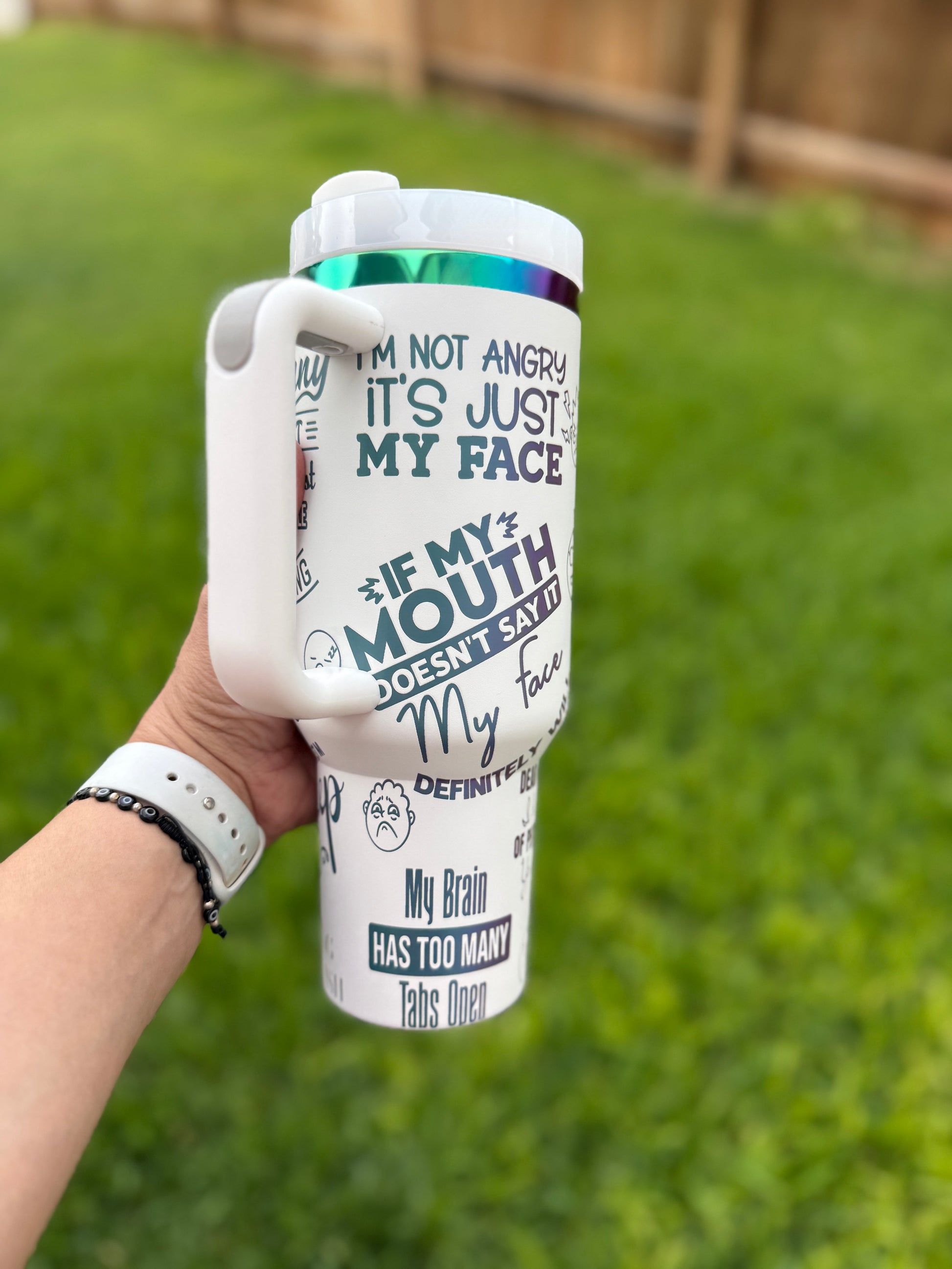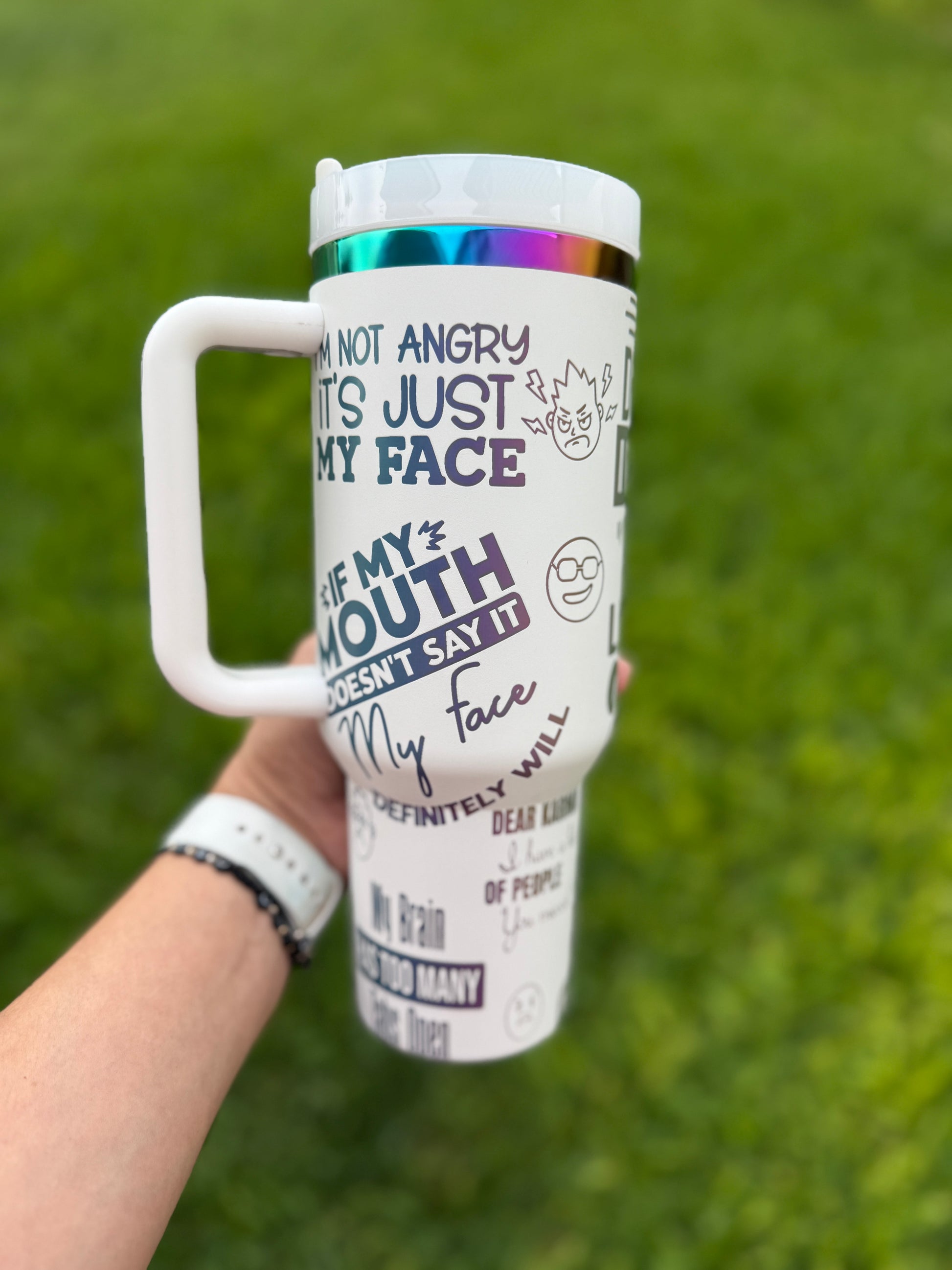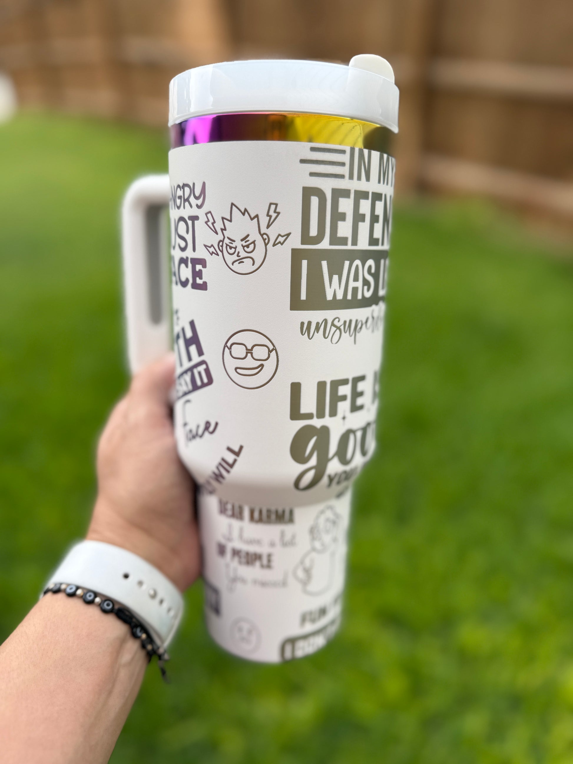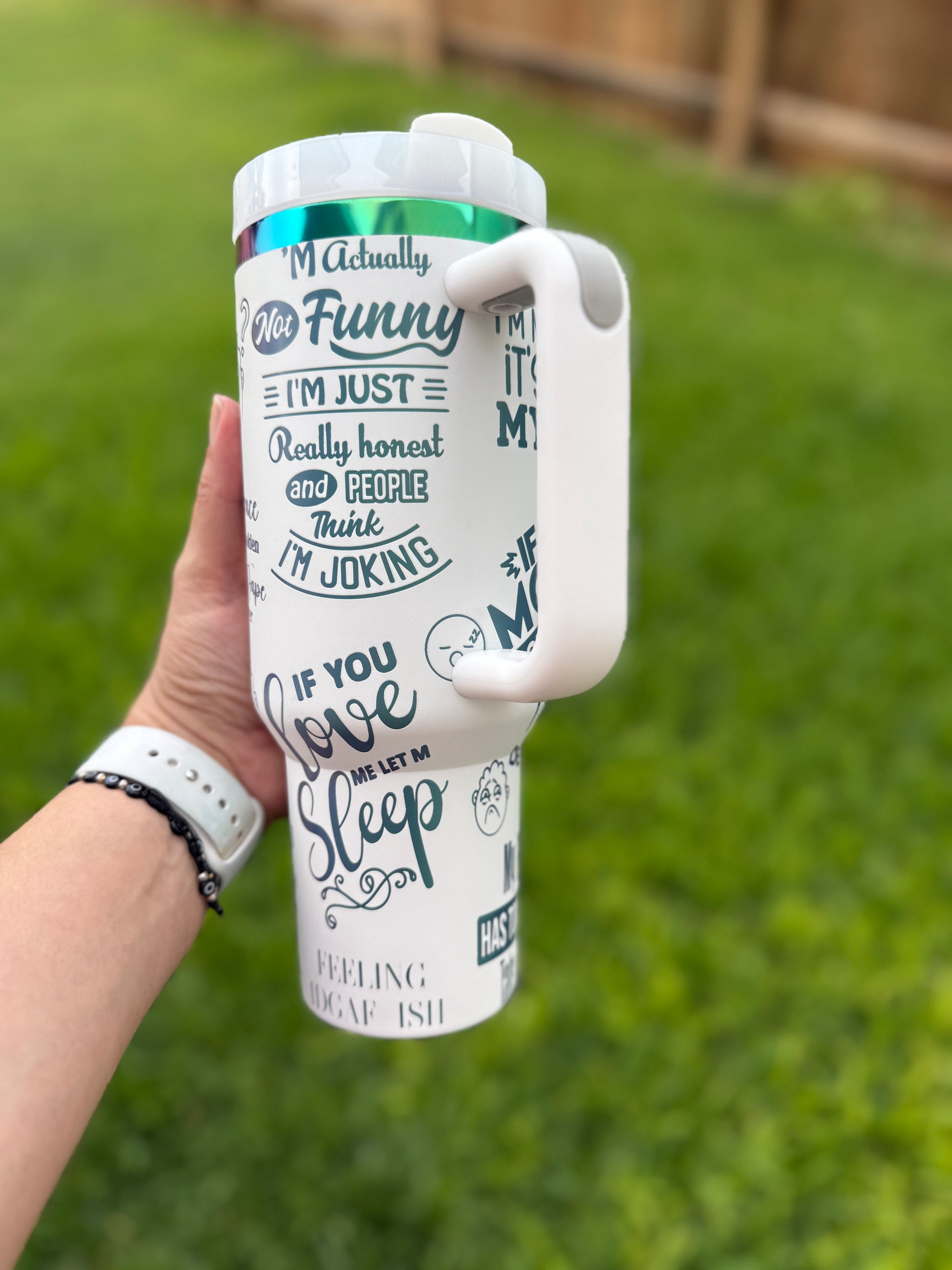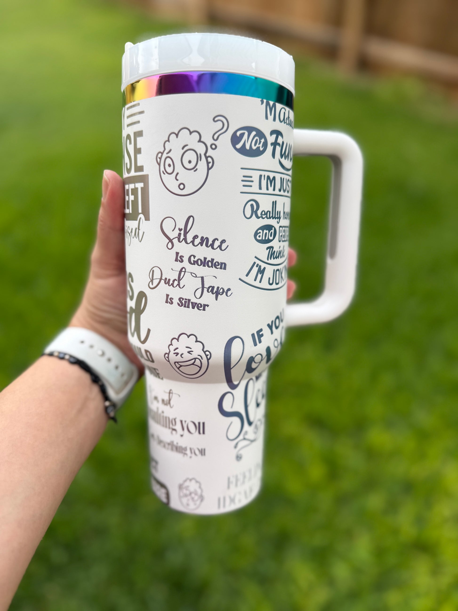 This 40 oz Sarcastic Funny Quencher Tumbler is designed to match every mood and spark laughter wherever you go. Its bold, witty design makes it a perfect conversation starter and a fun way to express your personality. With a large capacity to keep you hydrated and a vibrant rainbow plated finish, it’s both practical and playful—ideal for brightening your day and making friends smile. Durable and eye-catching, this tumbler turns hydration into a humorous experience.